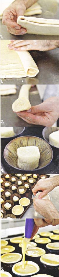 Com um rolo, estenda a massa (40 x 15 cm ) e dobre três vezes, passando uma camada de margarina entre as voltas. Deixe descansar por l0 minutos na geladeira e volte a estender. Dobre as duas extremidades para o centro, passando margarina entre as dobras, e novamente ao meio. Deixe descansar mais 10 minutos na geladeira.